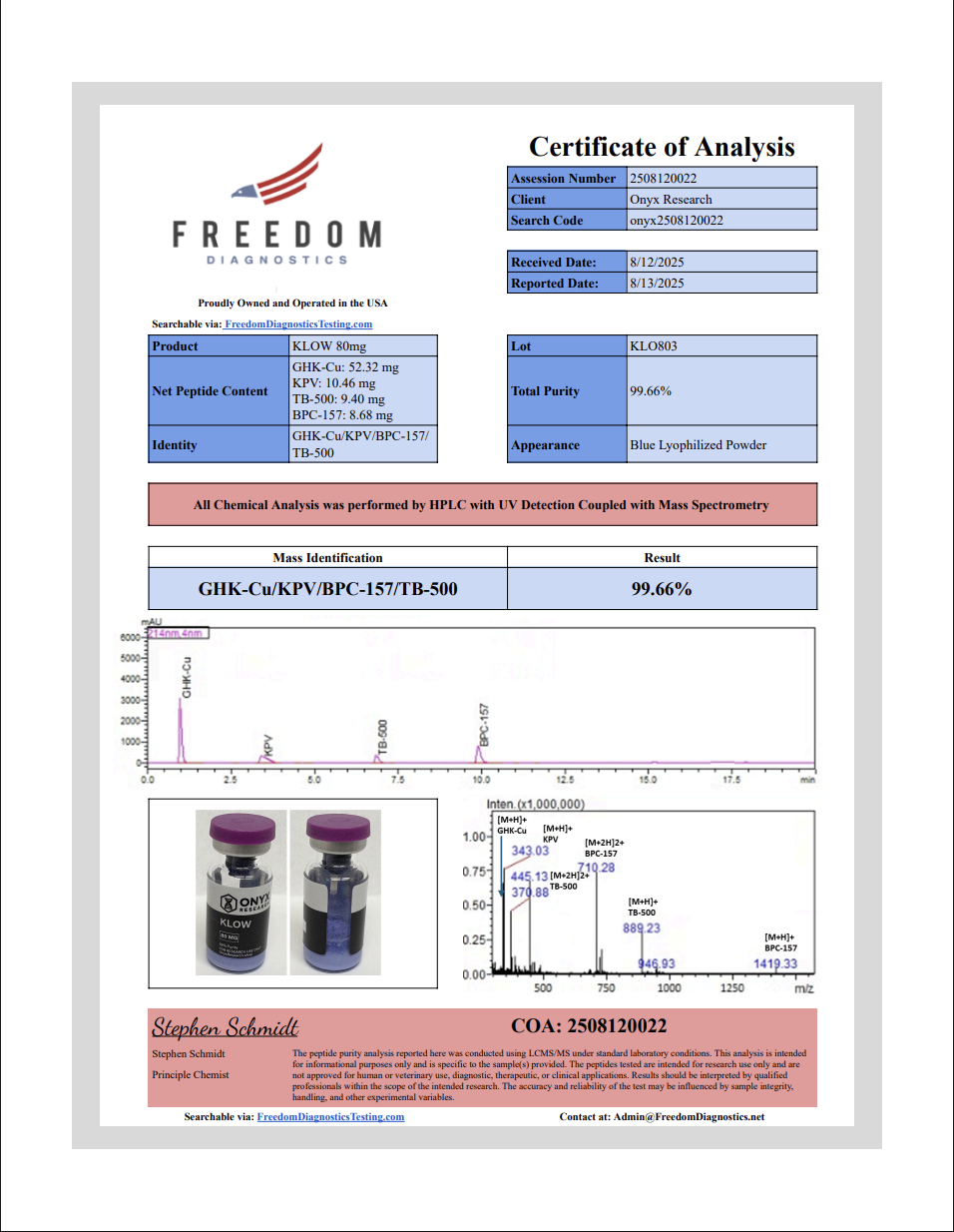For In Vitro Research Use Only – Not for Human or Veterinary Use KLOW is strictly for in vitro laboratory research only. Not for human or animal use. Do not use in food, drugs, or diagnostics. This compound has not been evaluated by the FDA. It is not intended to diagnose, treat, cure, or prevent any disease. For use by qualified research personnel only. All Onyx Research sales are final. Purchasers affirm they are trained professionals responsible for proper handling and compliance.KLOW | 80mg